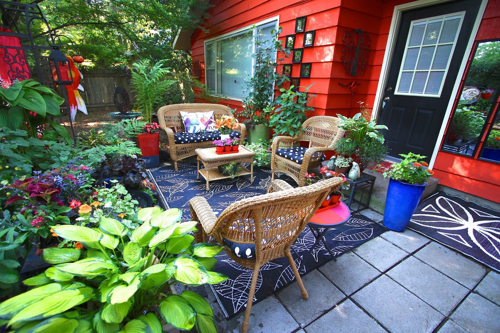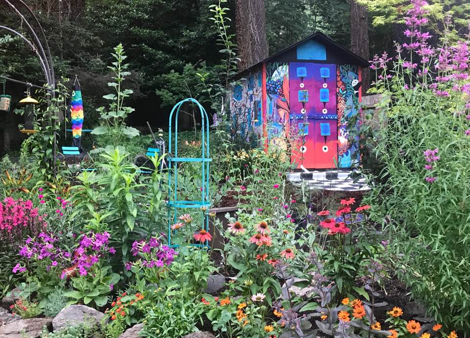 BELOW SANDRA’S HOME AND VIEWS OUT OF THE STUDIO WINDOW INTO HER GARDENS.